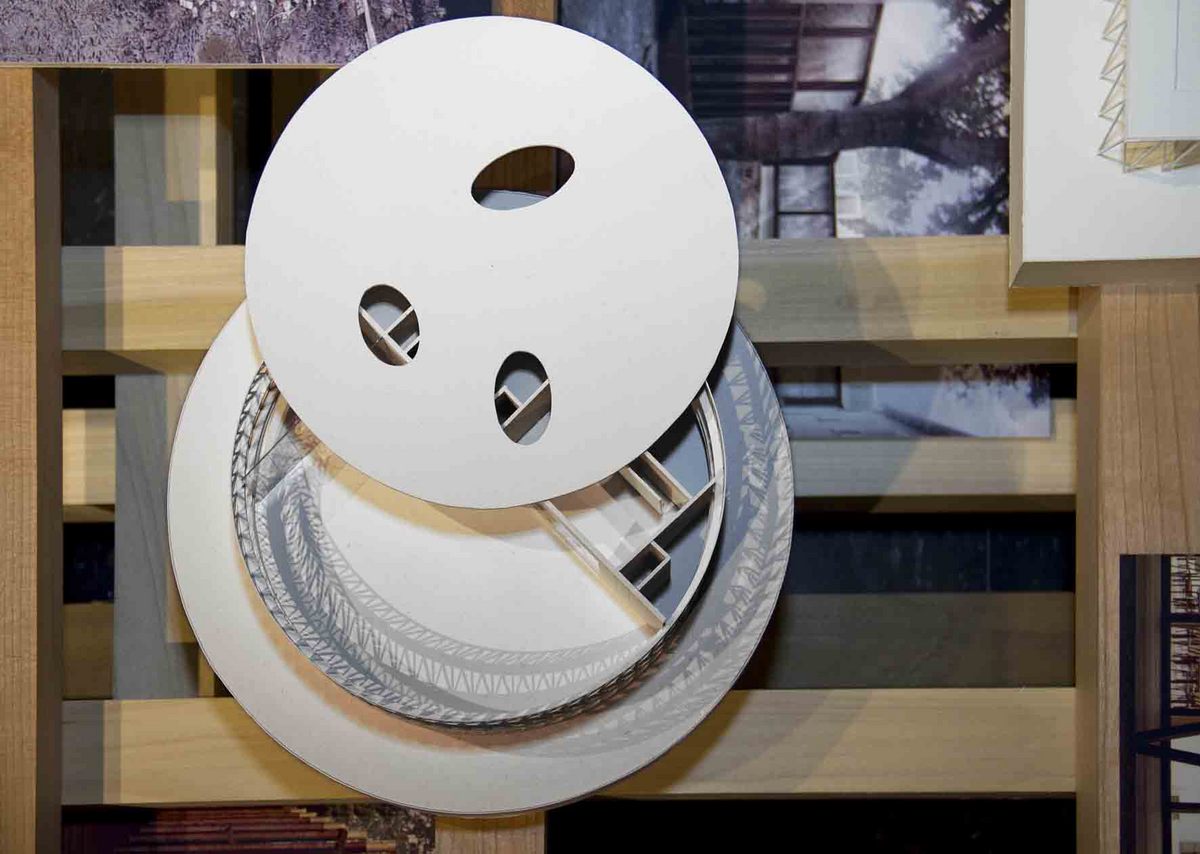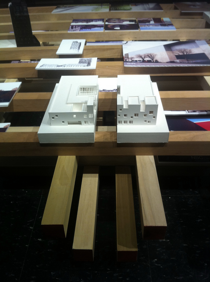 As if lifted from the firm’s Treviso studio and planted directly within MIT, a working table of models and drawings composes the central space of the gallery, juxtaposed with the firm’s recent built works.