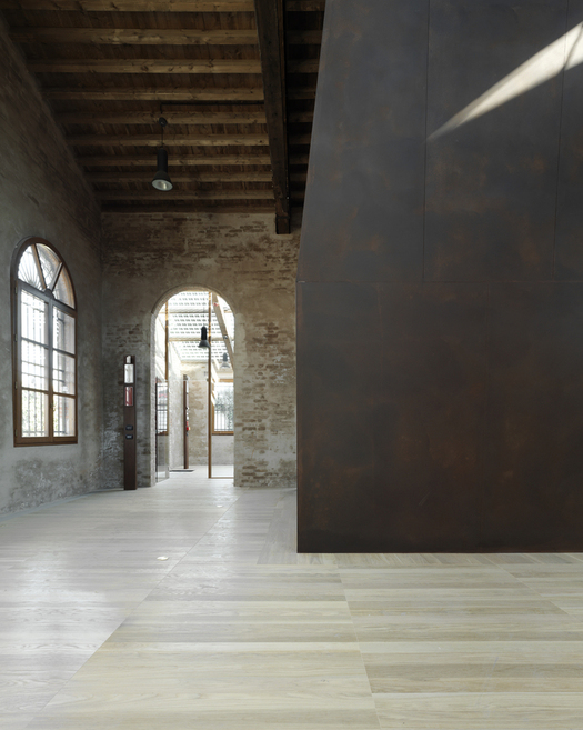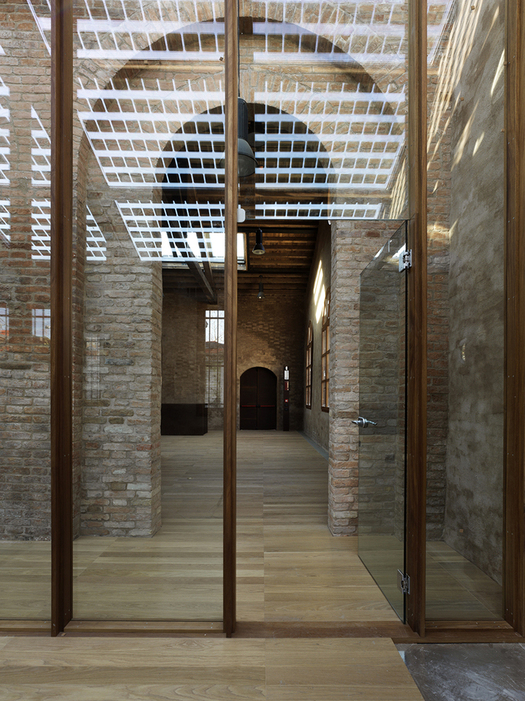 The glazed vertical panels are designed by very thin structural wood elements able to divide the void space in different rooms though maintaining the atmosphere of the entire space of the 'teza', but enriching the complexity of reflexes on the different materials which stratify and bounce on the existing surfaces.